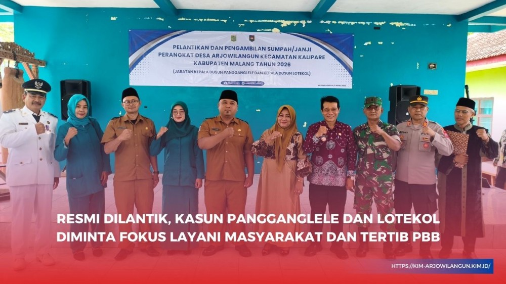 ARJOWILANGUN – Dinamika kepemimpinan di Desa Arjowilangun memasuki babak baru dengan dilantiknya dua Kepala Dusun (Kasun) terpilih pada Kamis (09/04/2026). Prosesi pengambilan sumpah jabatan yang berlangsung di Pendopo Desa Arjowilangun tersebut menetapkan Slamet Adi Saputro dan Darmawanto sebagai pemangku wilayah di Dusun Pangganglele dan Dusun Lotekol.